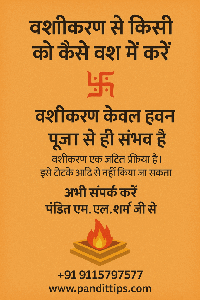 वशीकरण एक ऐसा शब्द है जो सुनते ही मन में रहस्य, शक्ति और प्रभाव की भावना पैदा करता है। बहुत से लोग यह जानना चाहते हैं कि “किसी को वशीकरण से कैसे वश में किया जा सकता है?” लेकिन सच्चाई यह है कि वशीकरण कोई साधारण टोटका या मंत्र नहीं, बल्कि यह एक गहन वैदिक और तांत्रिक साधना है जिसे केवल अनुभवी और सिद्ध पंडित ही कर सकते हैं।