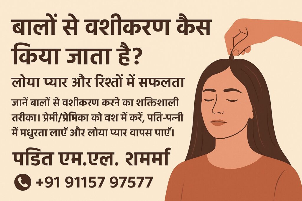 prakriya (saamaany jaanakaaree) sabase pahale jis vyakti ko vash mein karana ho, usake baal ka ek chhota hissa chaahie. us baal par vishesh mantrochchaaran aur pooja kee jaatee hai. yah anushthaan poorn gopaneeyata aur sahee samay (muhoort) par kiya jaata hai. isake baad vyakti kee soch aur bhaavanaen aapakee or aakarshit hone lagatee hain. ⚠ dhyaan rakhen: yah ek atyant goodh aur taantrik prakriya hai. ise keval anubhavee aur siddh pandit hee kar sakate hain. bina anubhav ke karane par yah nishphal ya haanikaarak bhee ho sakata hai. laabh khoya hua pyaar vaapas mil sakata hai. pati-patnee ke rishton mein madhurata aatee hai. prem vivaah mein aa rahee rukaavaten door hotee hain. manachaaha saathee aapake jeevan mein laut aata hai. sampark karen yadi aap bhee chaahate hain ki aapakee samasya ka turant samaadhaan ho aur sahee tareeke se baalon se vasheekaran karaaya jae, to aaj hee mujhase sampark karen.